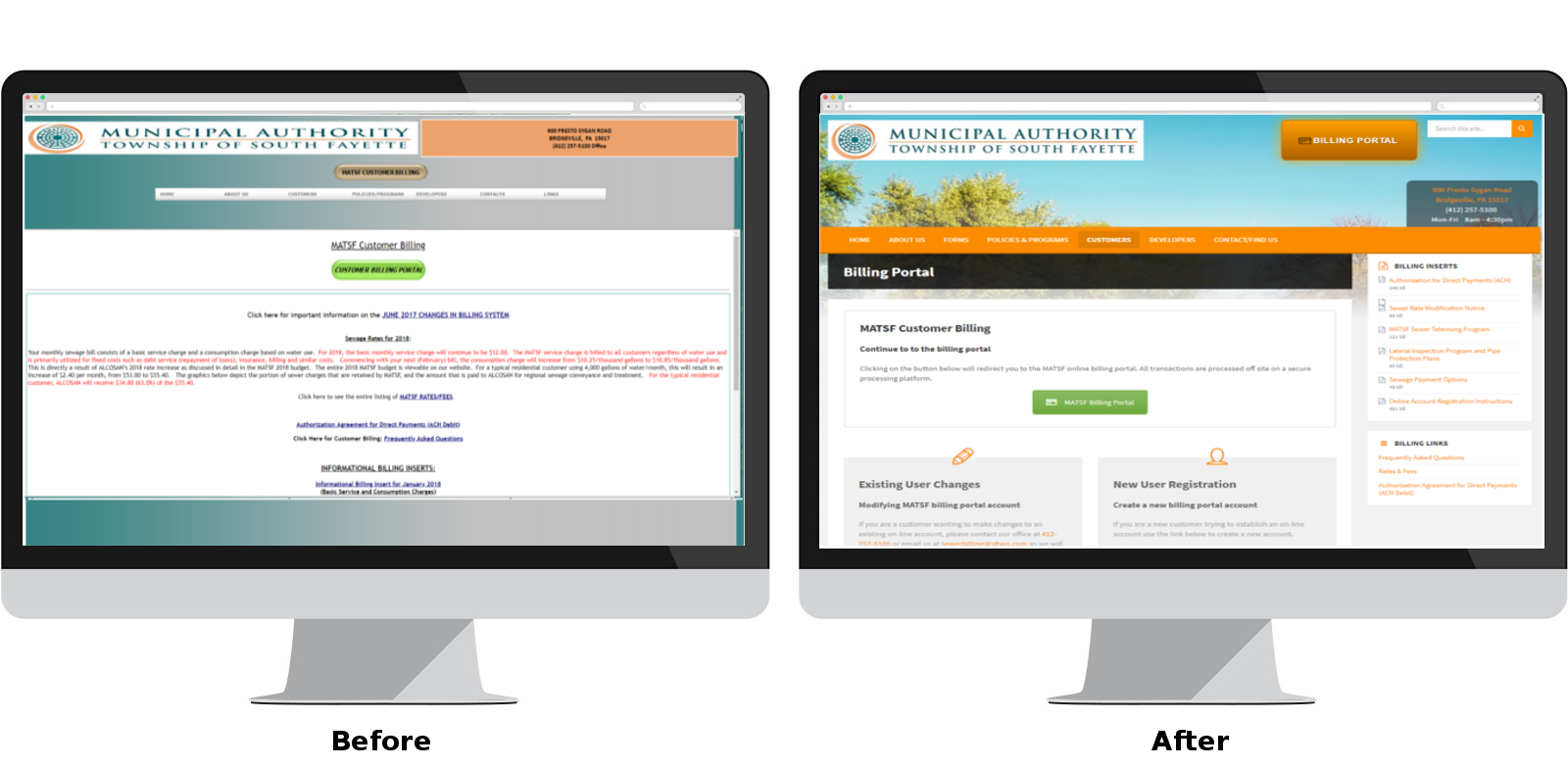 The municipal authority of South Fayette (MATSF) contacted me original to provide a quote to provide on-going maintenance for their existing website. The client has regular content updates that need to be added to the site. At the time of contacting me, the clien thad an outdated website which was not responsive to different screen sizes and was difficult to navigate. After discussions, we have decided a complete website overhaul would be the best approach. I was able to deliver MATSF a website that would allow users to easily navigate the website on all devices including cell phones and tablets. Most importantly they were provided a website that utilizes a content managment system (CMS) backend which will allow for easy updating and additions in the future.